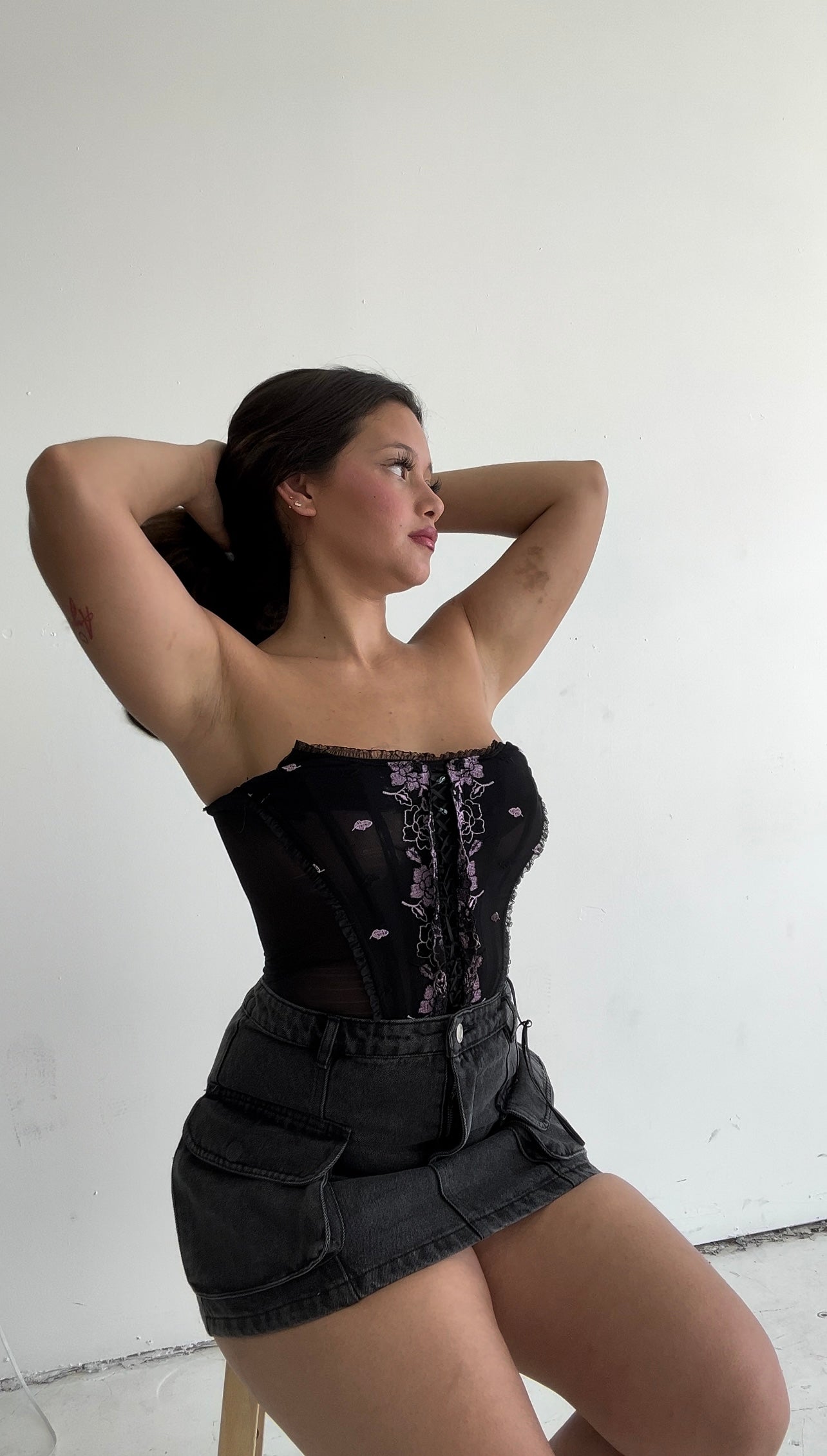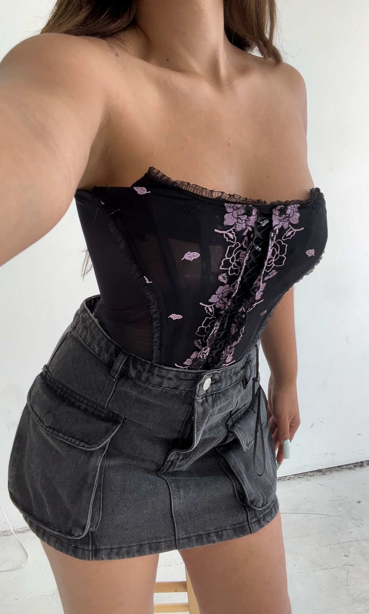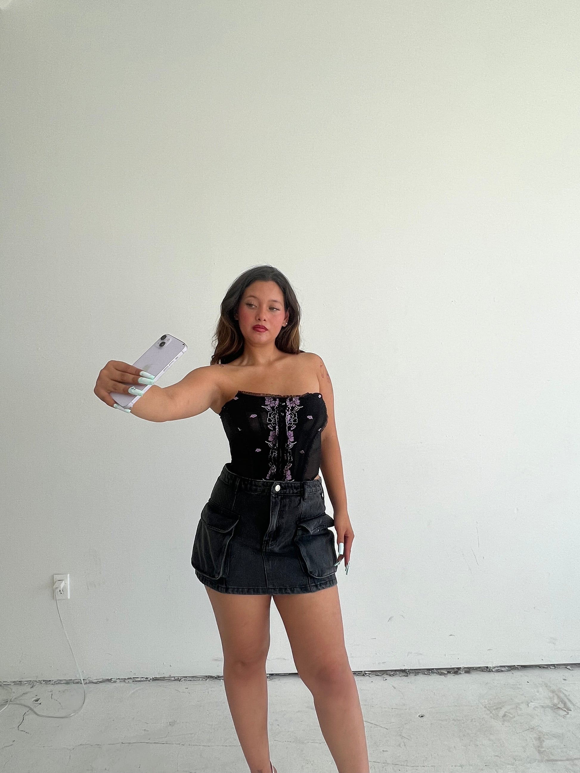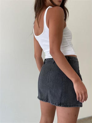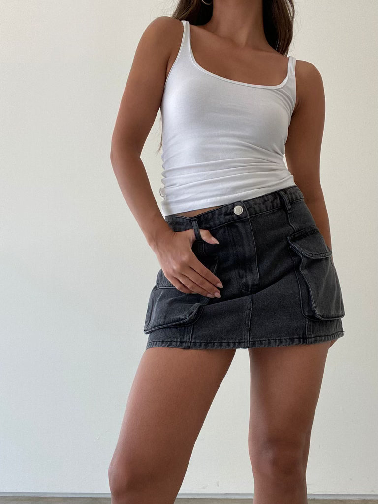 This denim charcoal skirt comes with two pockets in the front. It is a comfortable fit and cool material.