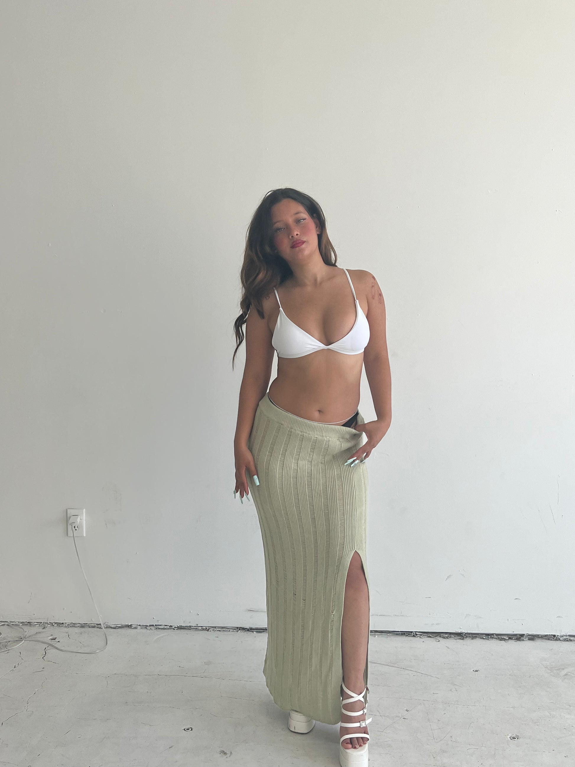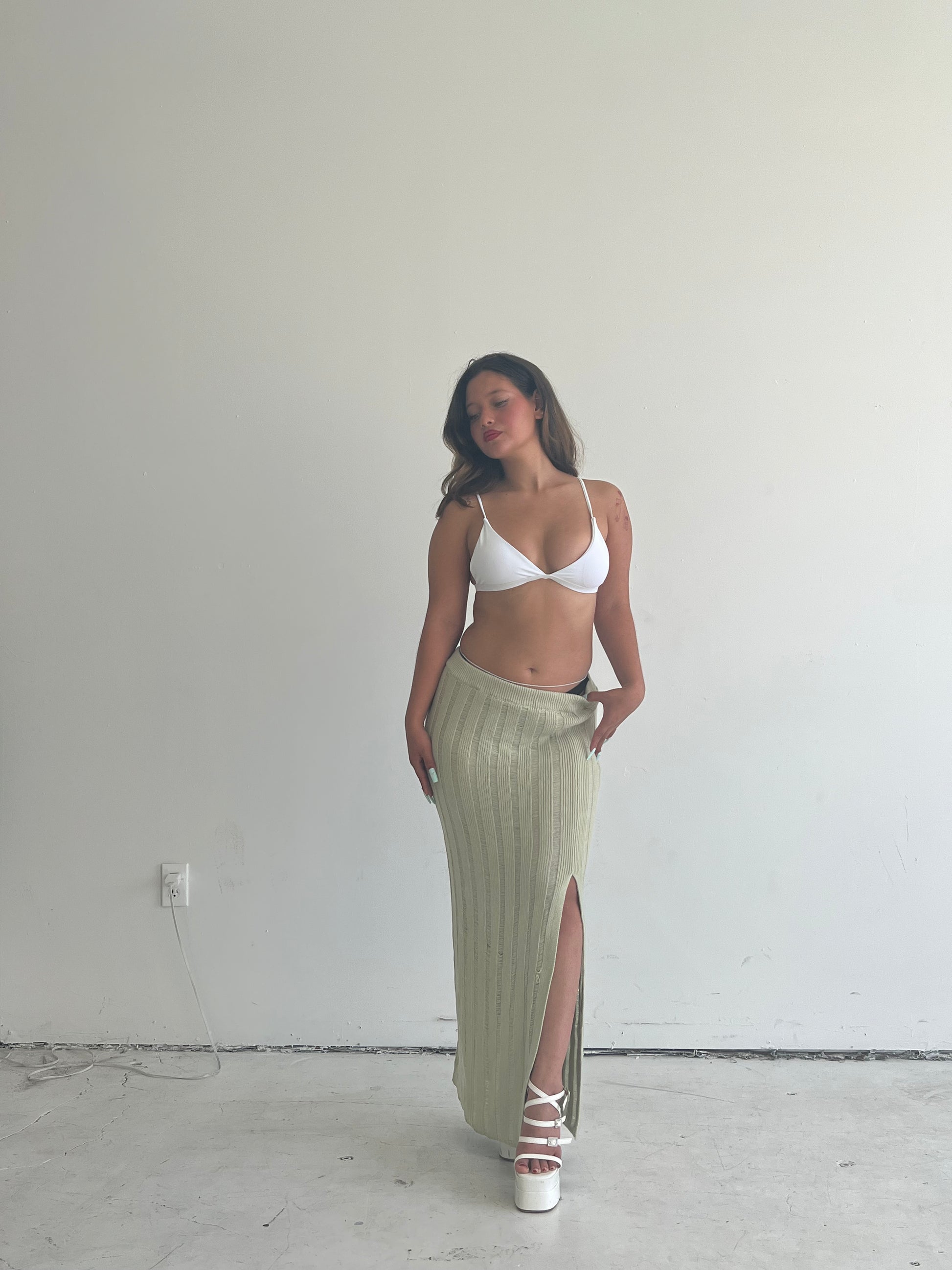 This see through long sweater skirt comes with a long slit on the side, it’s perfect for the beach and summer weather.