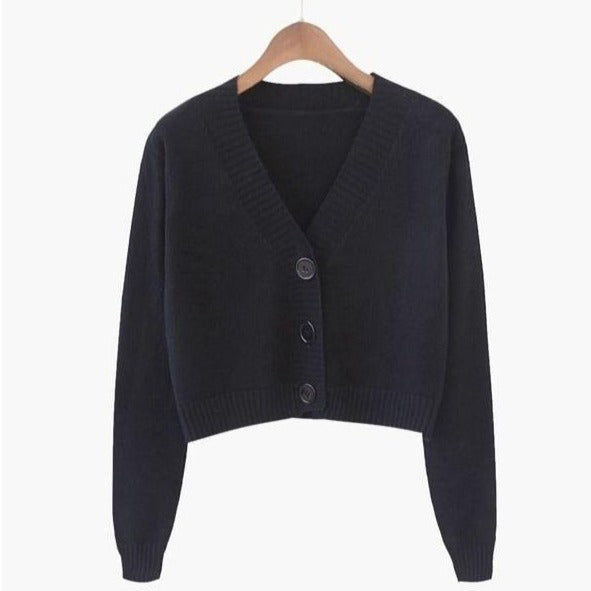 This long sleeve knitted cropped cardigan comes with a V neck front and three buttons. It is only available in black and is a staple almost everyone needs in their closet.