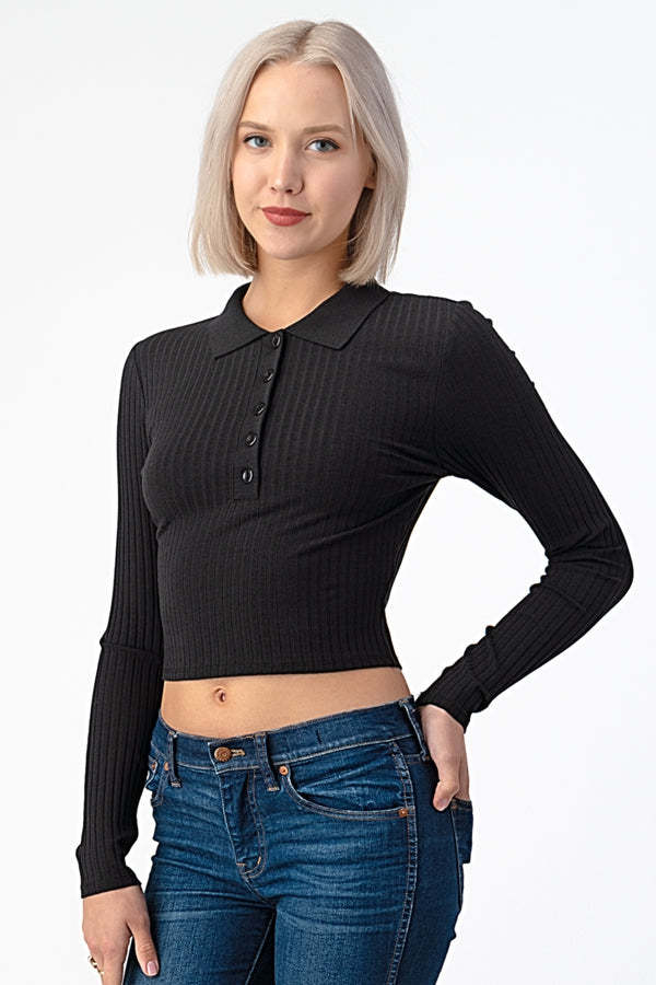 This long sleeve polo top is coming in for our fall launch and is smooth and comfy. It is meant to hug the body and comes with a collar and buttons alongside the front.