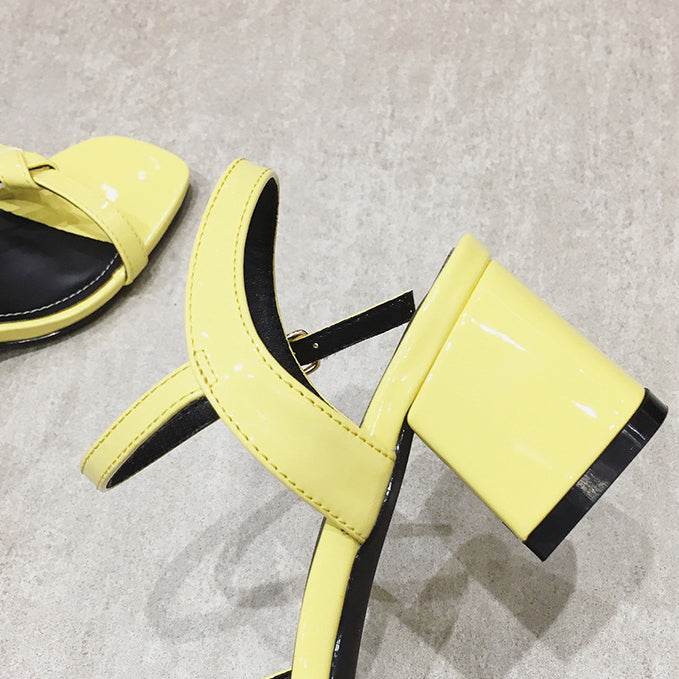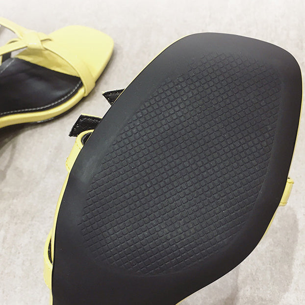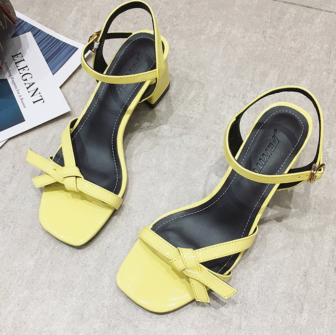 Casual yellow chunky kitten heels with font mini bow tie with stitched detailing that outlines in a slightly lighter color. These heels are formed in a sandal style to keep one's feet hurting. Alongside this, it is a square toe design.