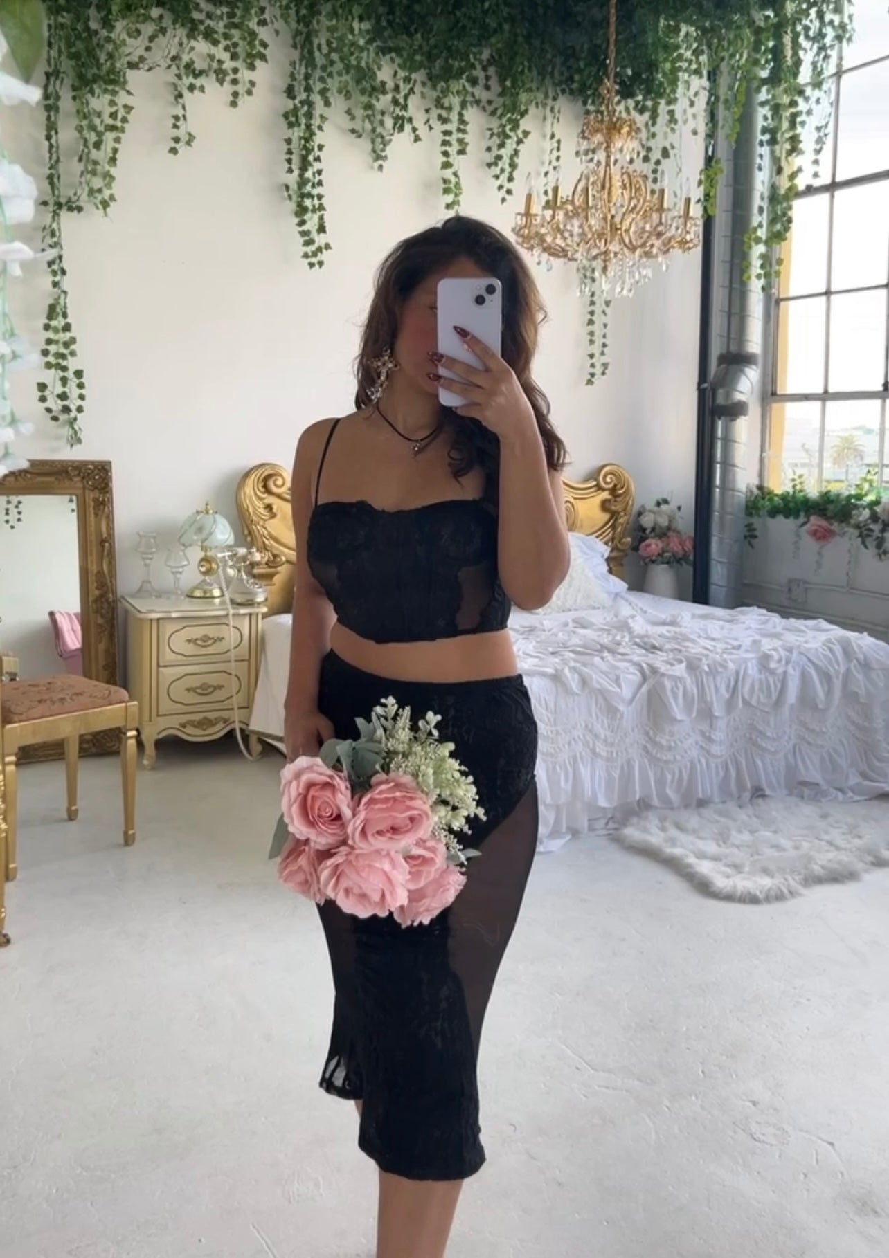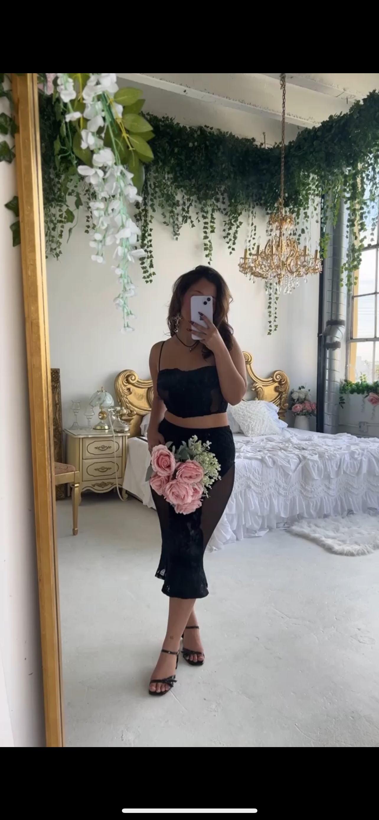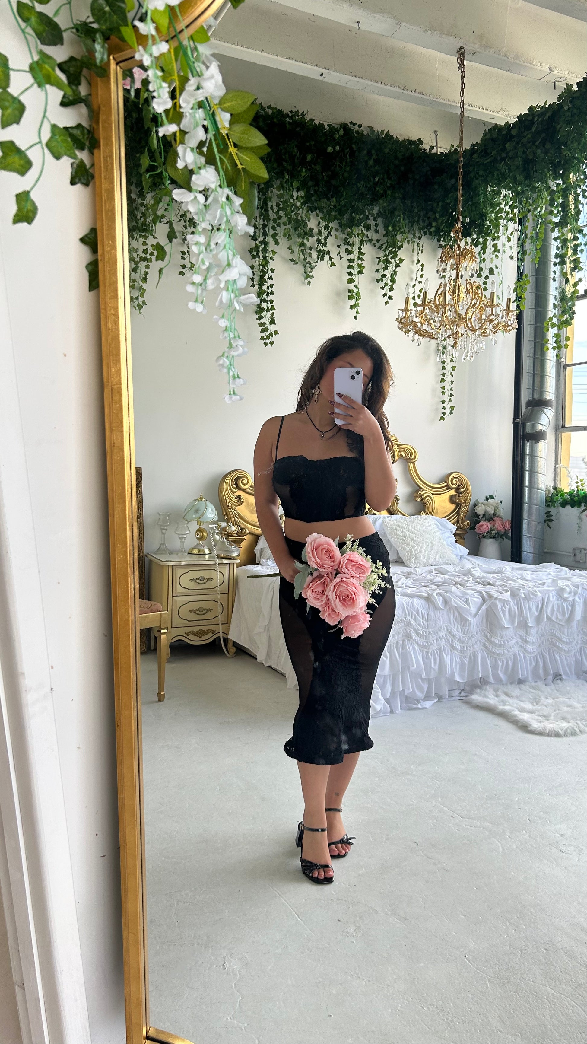 This two piece set comes with lace detailing. The top is very comfortable and has three levels of adjustment to the corset. The bottoms come in a mermaid style. It is loose at the top, then cinches towards the center of the skirt. If you have body adjustments like bbl please size up.