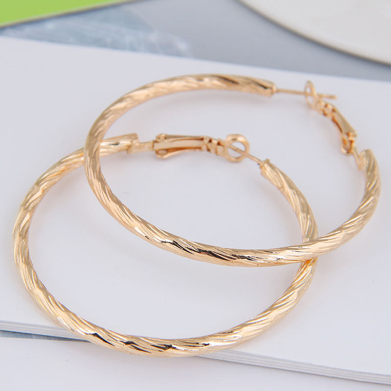 These hoops are 50mm in size and come with a twist detailing. They're only available in the color gold and come with a clasp thats make it easy to put on.