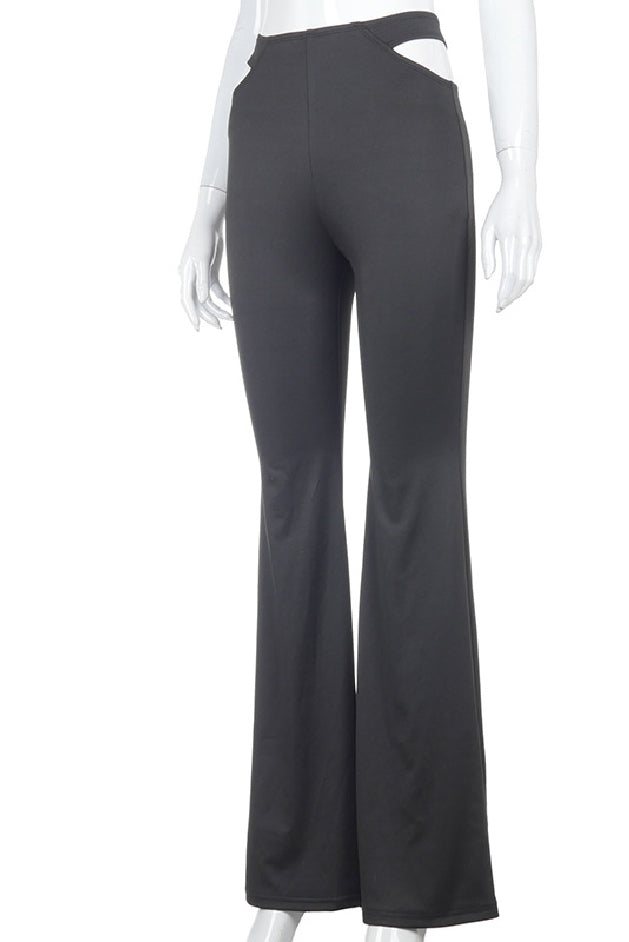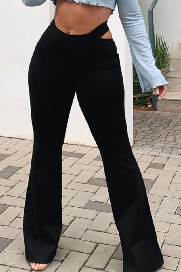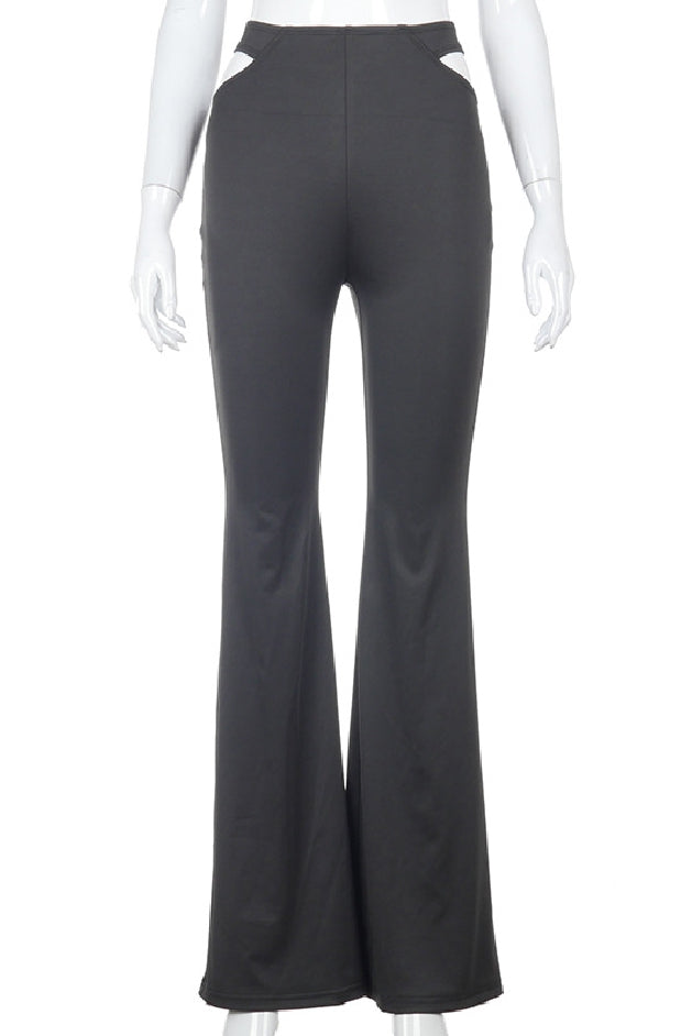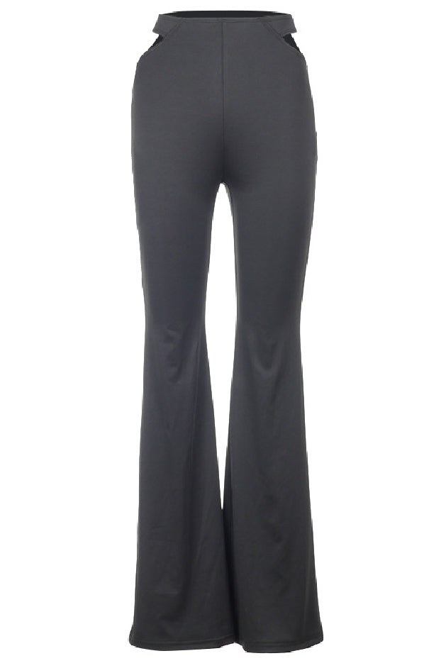 These flare pants come in the color black and are smooth to the touch. The whale tail does an amazing job of not allowing the pants to fall. They are fit at the waste and feel very comfortable in movement. The material is stretchy yet fit at the body.