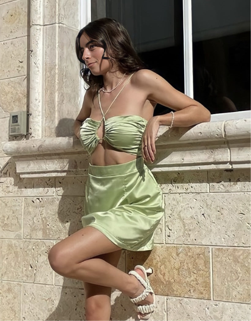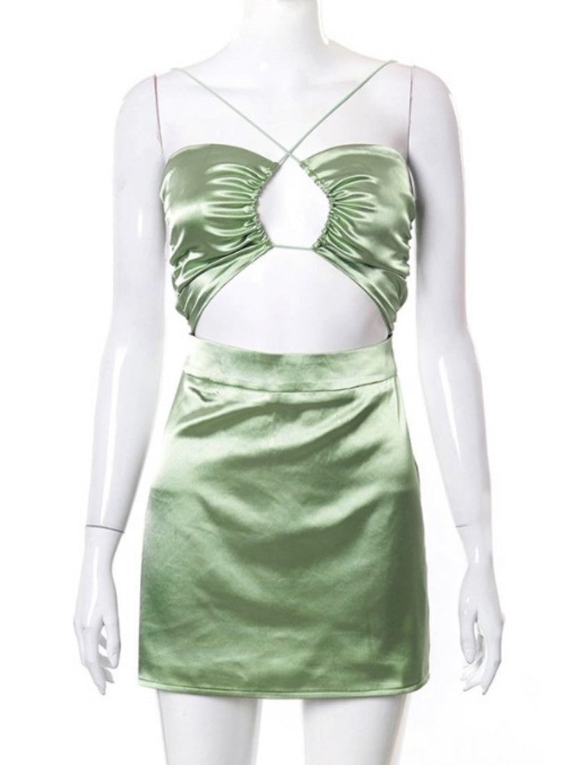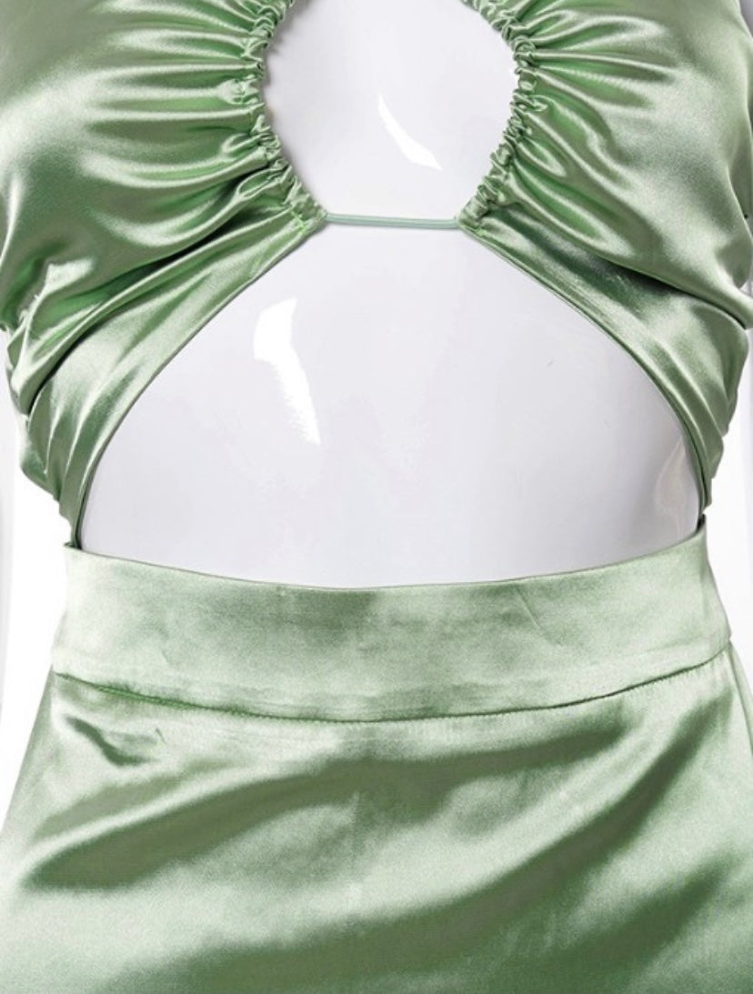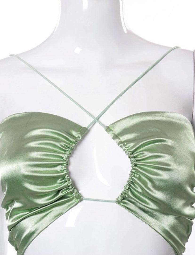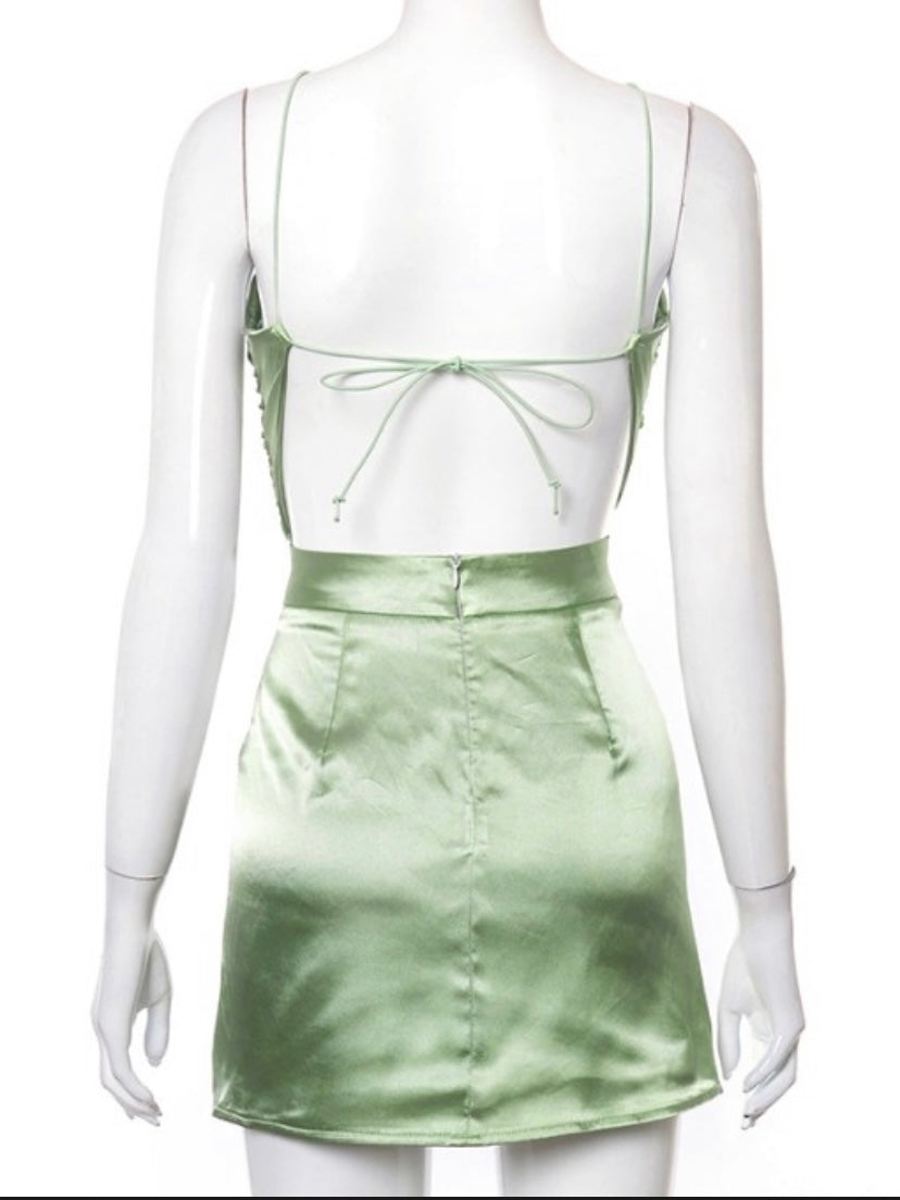 This beautiful one piece dress is a lovely green color that comes with a shine in the fabric. It is sleek & the material is satin, so it doesn’t dry out the skin. It comes with a zipper skirt & a wonderful cross over top piece that highlights the breasts. It’s meant to fit comfortable & drape on the body creating an elegant European inspired outfit