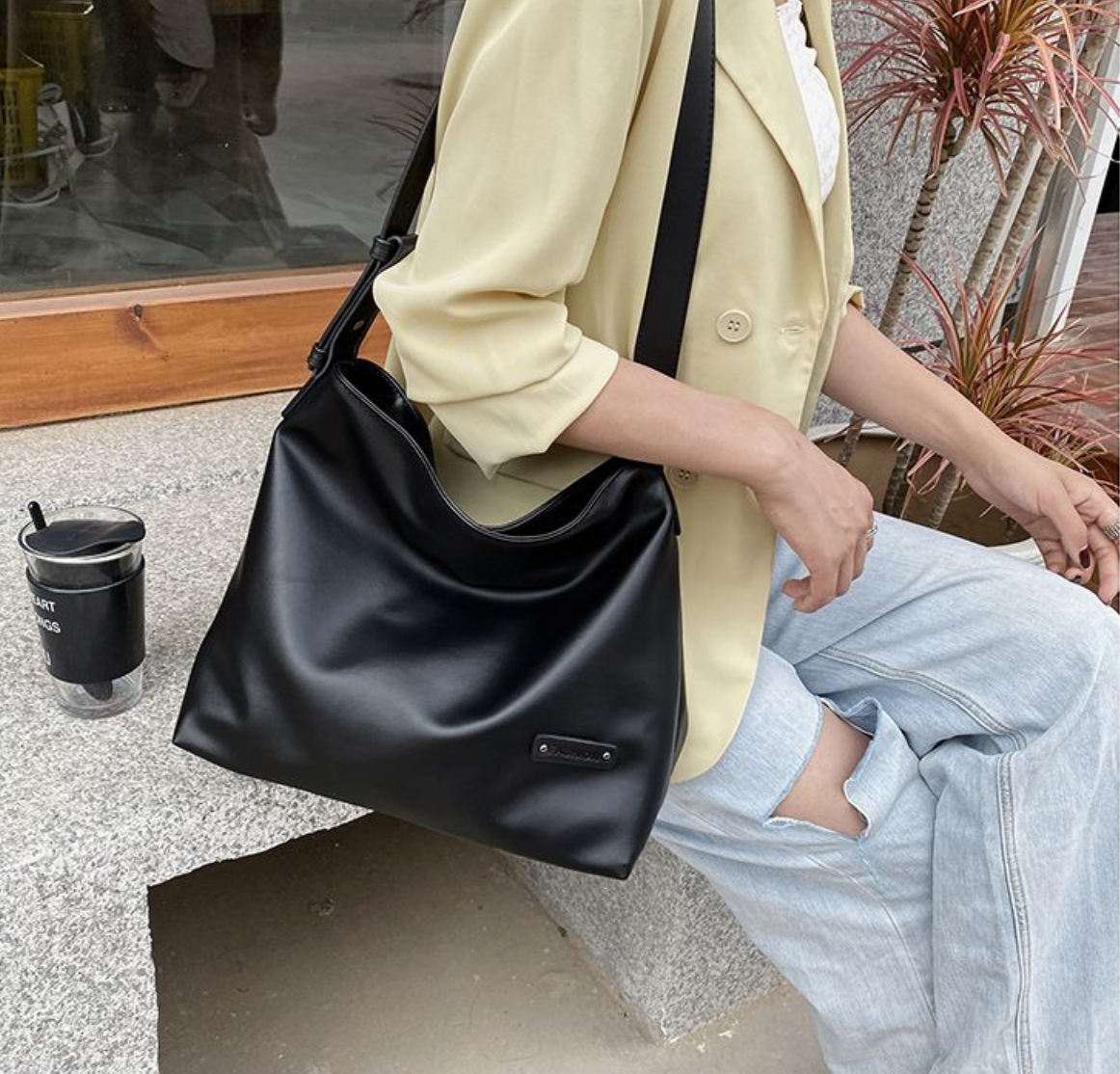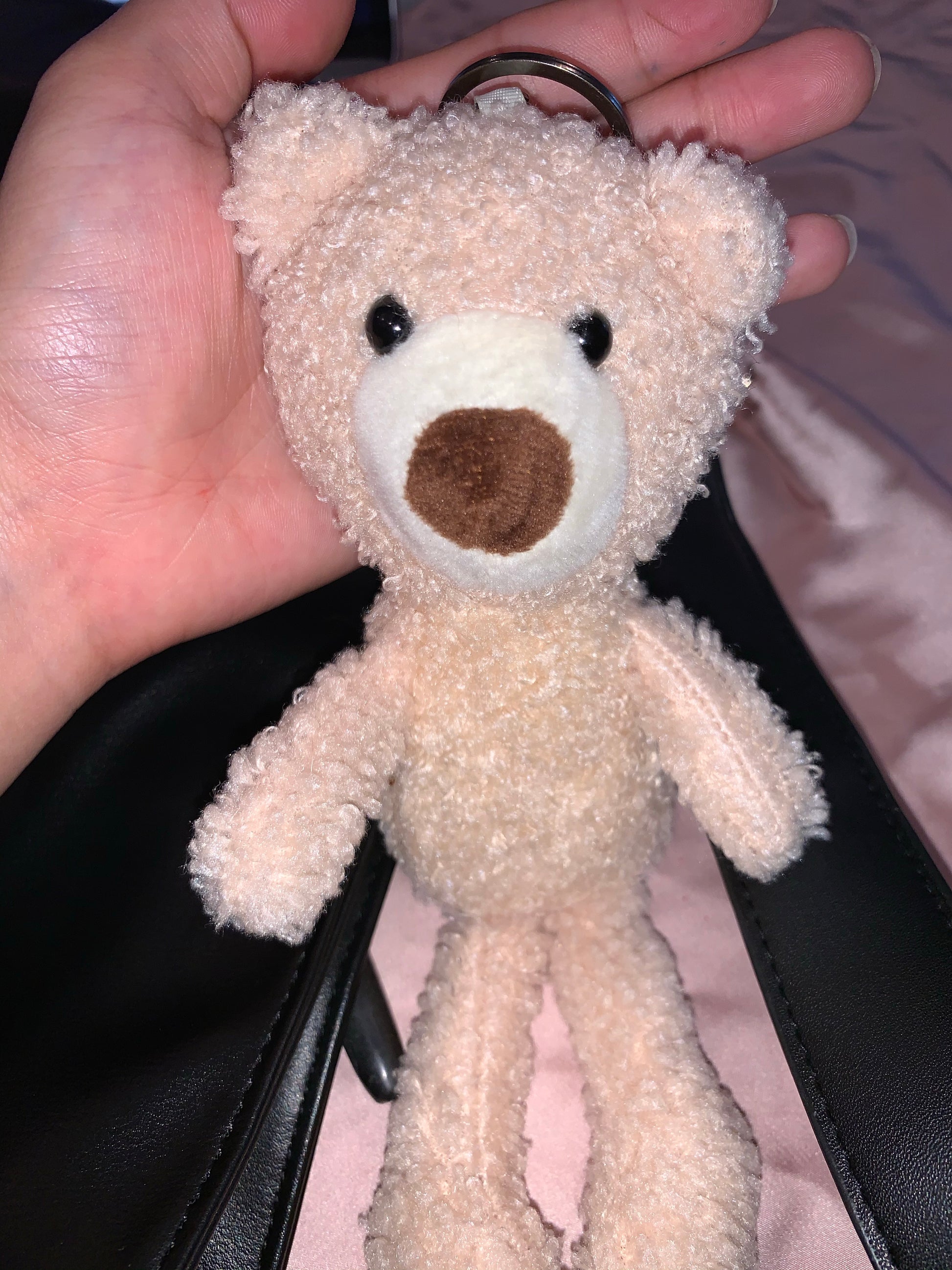 This black faux leather tote bag comes with burgundy lining inside and is very smooth to the touch. It is a good size and able to hold a capacity of items while not being overwhelming in size. It comes with an adorable bear key chain and an adjustable strap on one side.
