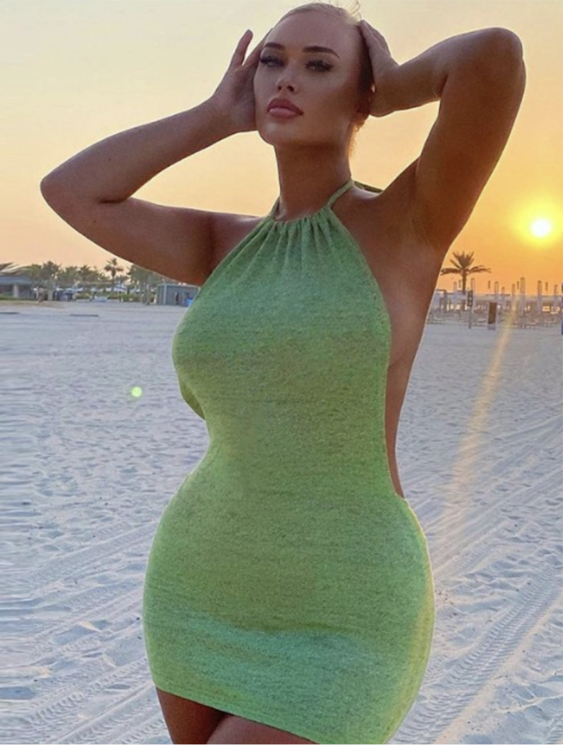 This green sexy low back halter mini dress comes made with a textured cotton material. It is a sleeveless meant to be worn anywhere.
