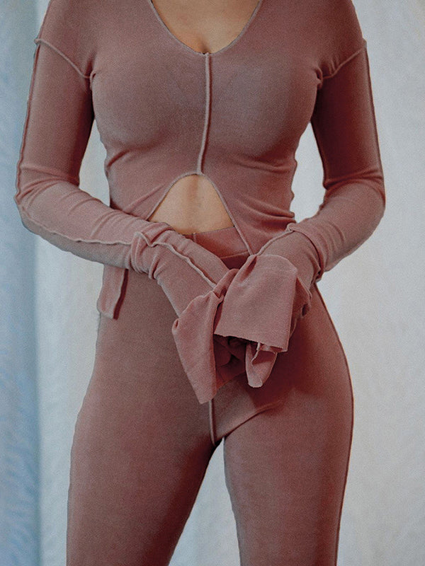 Sexy long sleeve two piece with opened front crop top peice and matching pants. This product is currently only available in the color pink.