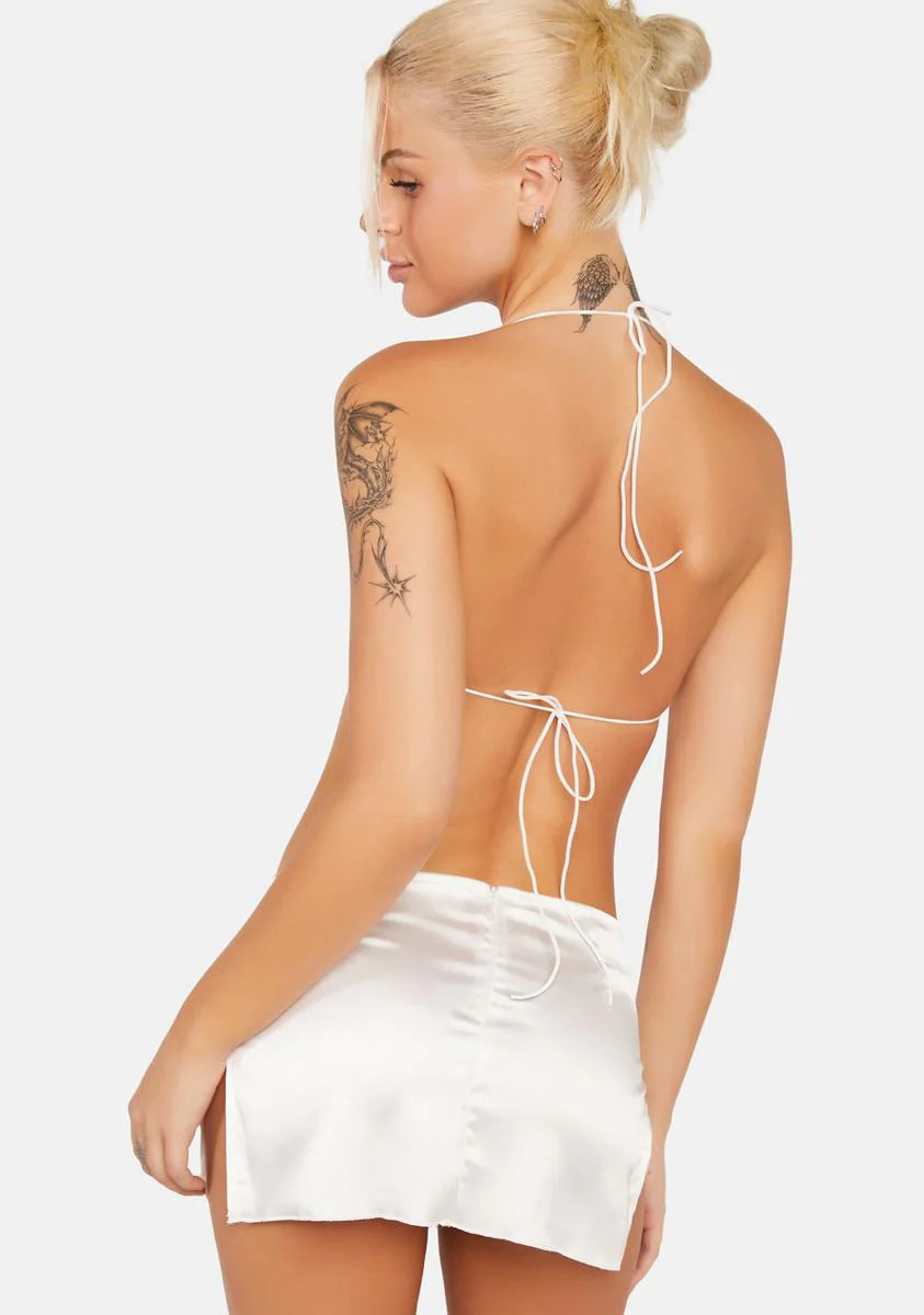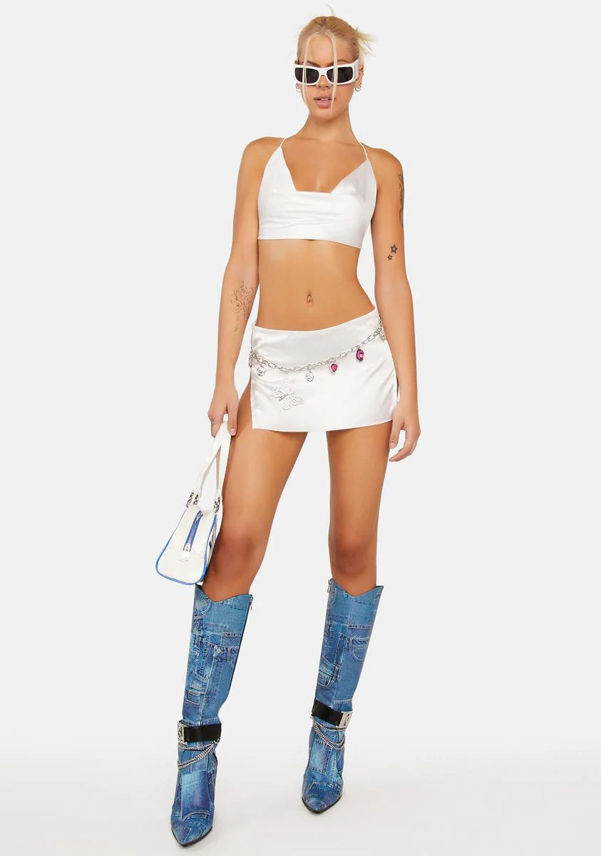 This two piece satin set comes in the color pearl. The skirt comes with slits on both sides of the skirt. The top is a bandeau top with adjustable straps. This does run small, please refer to the size chart below. This set is meant to be worn as a low rise mini skirt set.