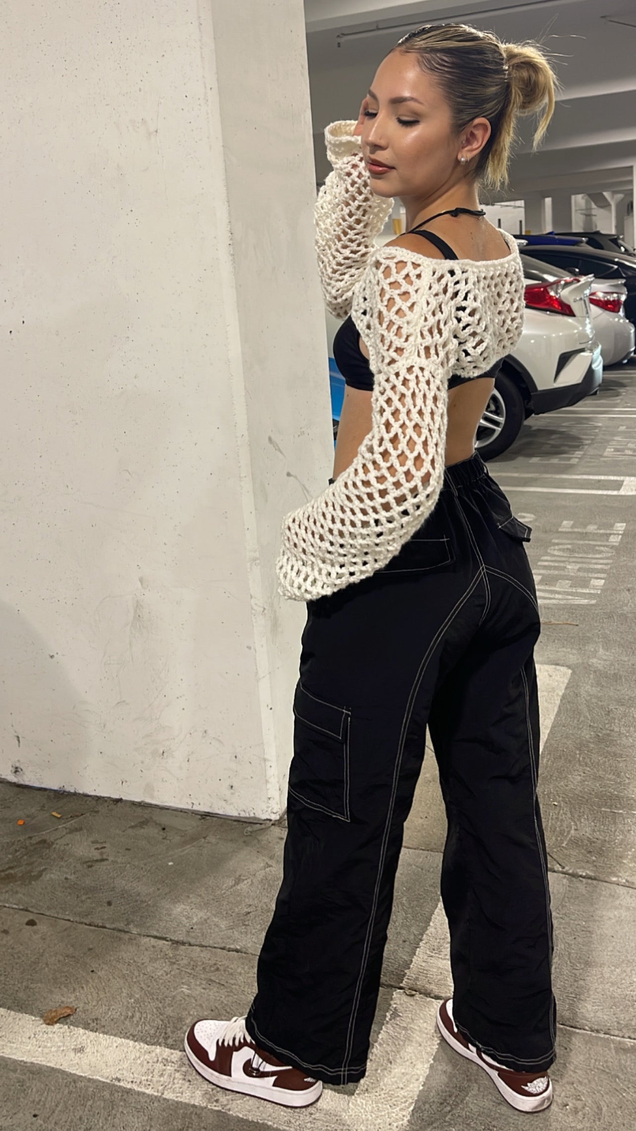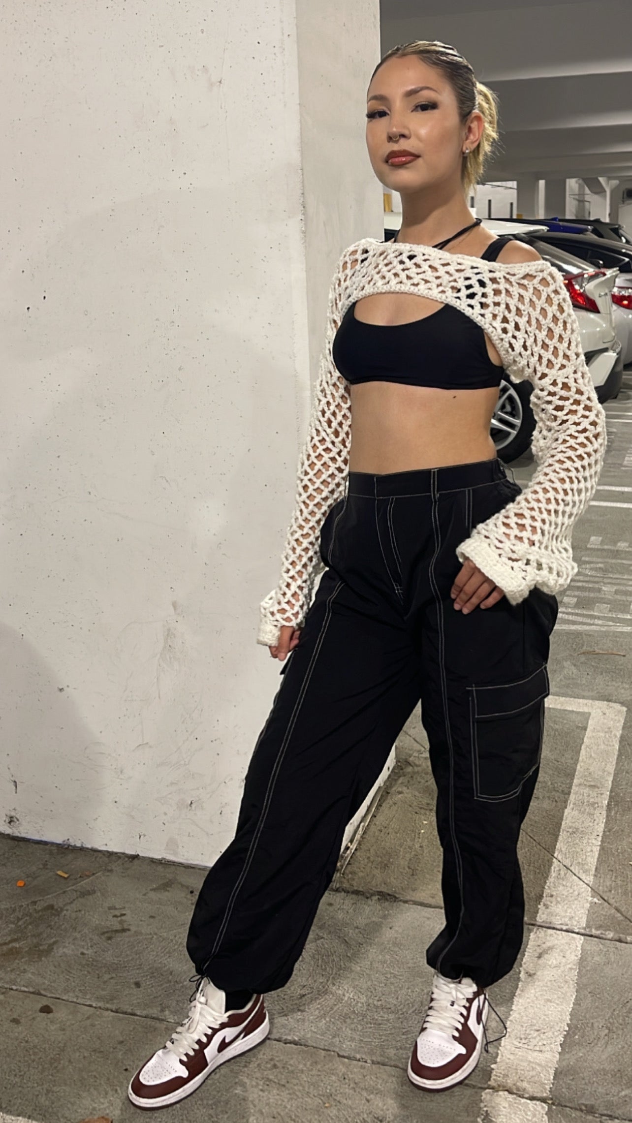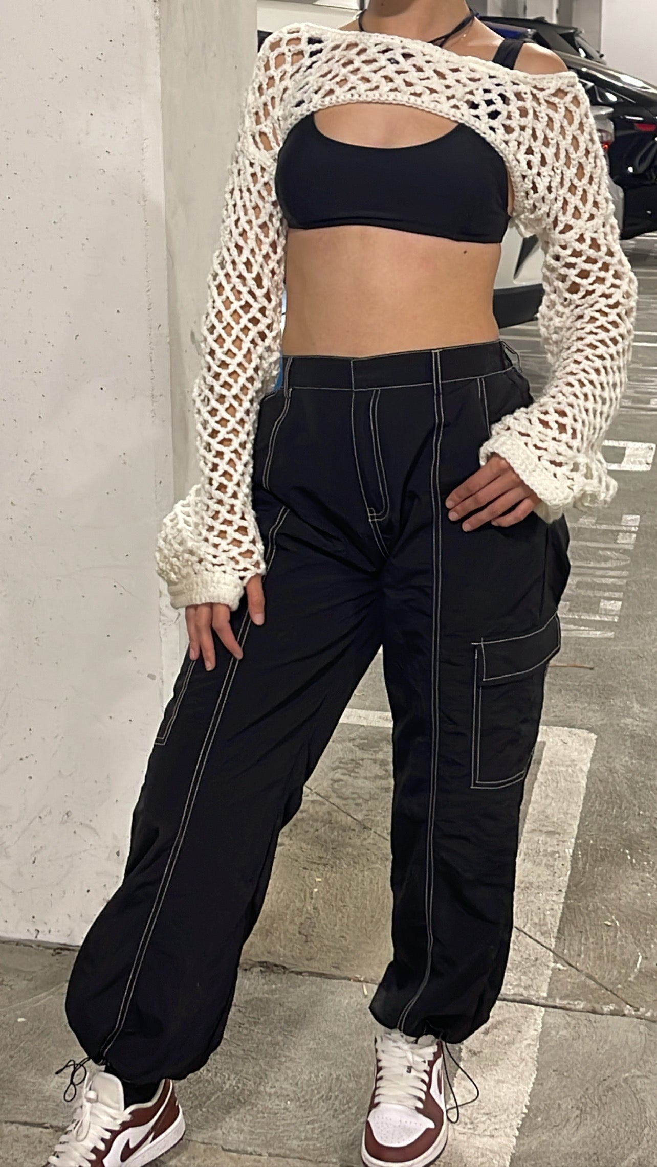 This cargo pants set comes with an adjustable strap at the bottom of the pant. It has white stitching detailing and are hugging to the body.