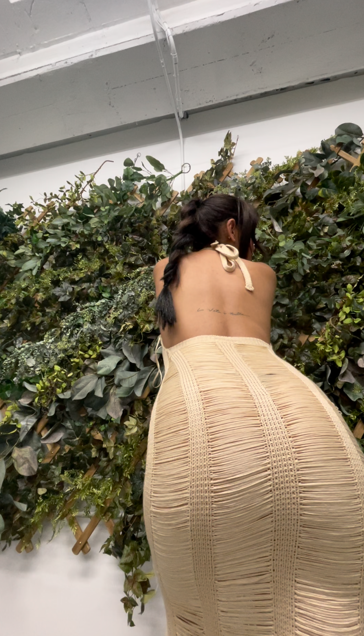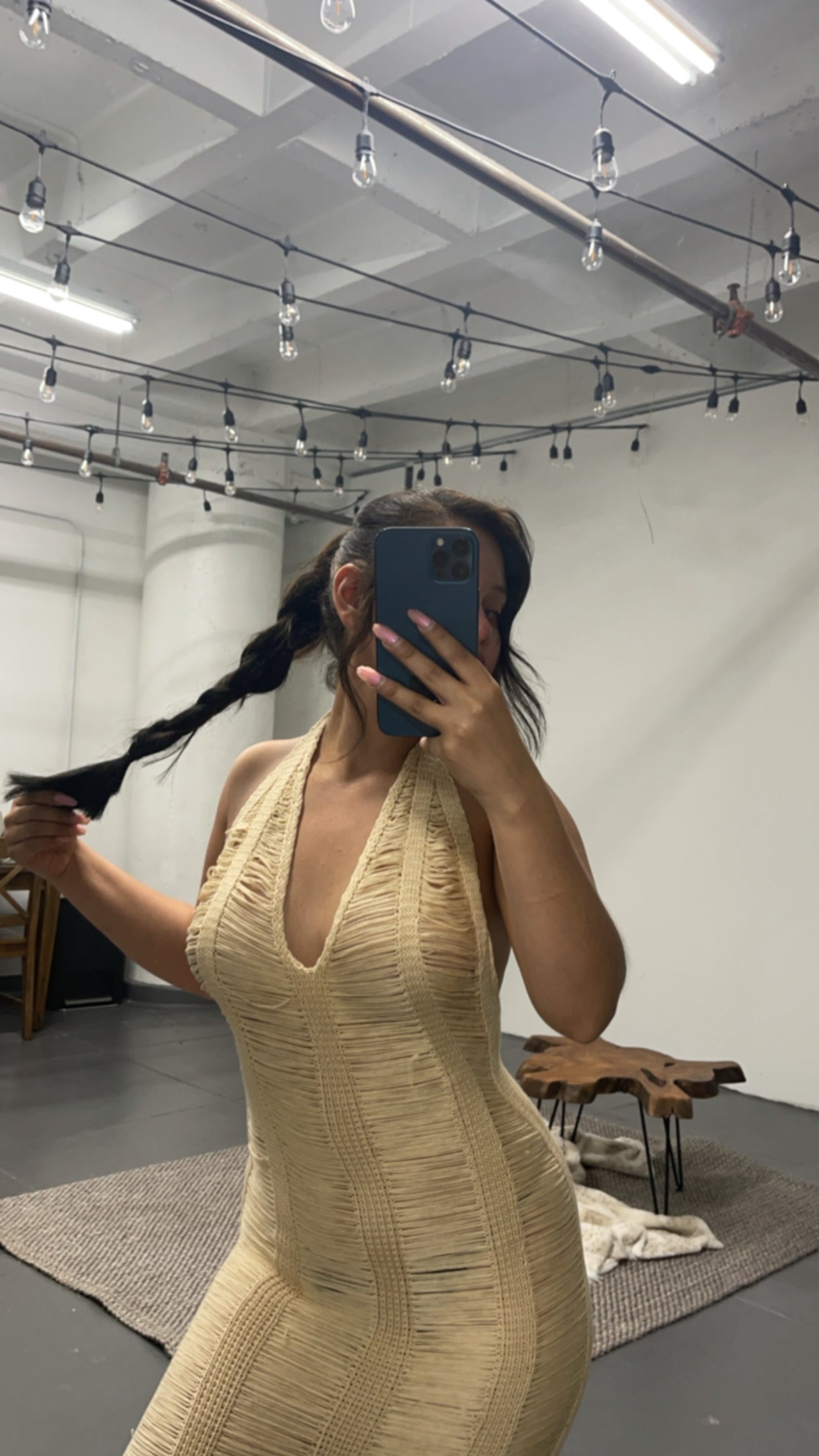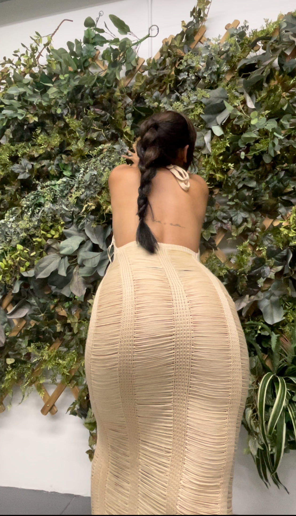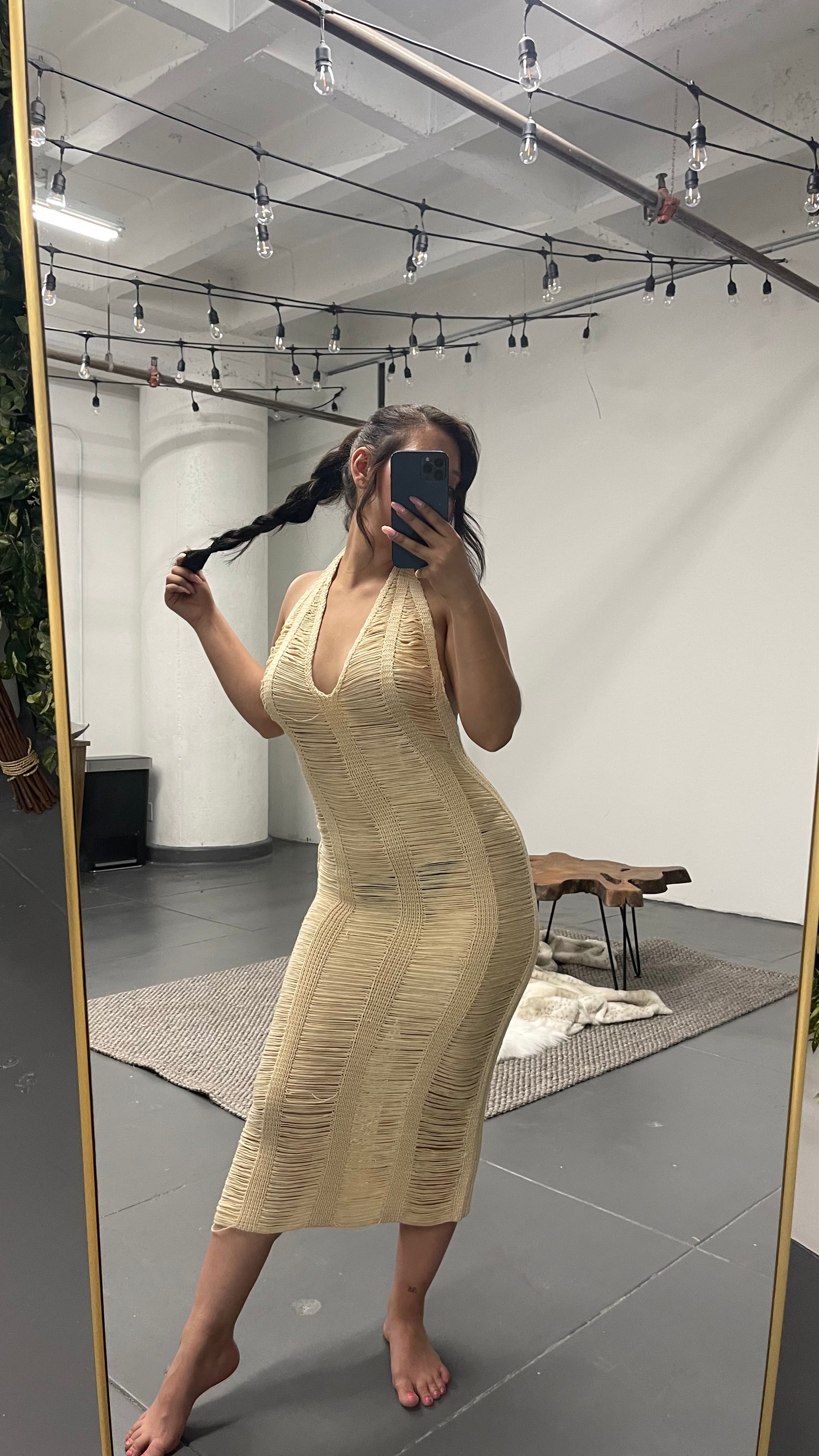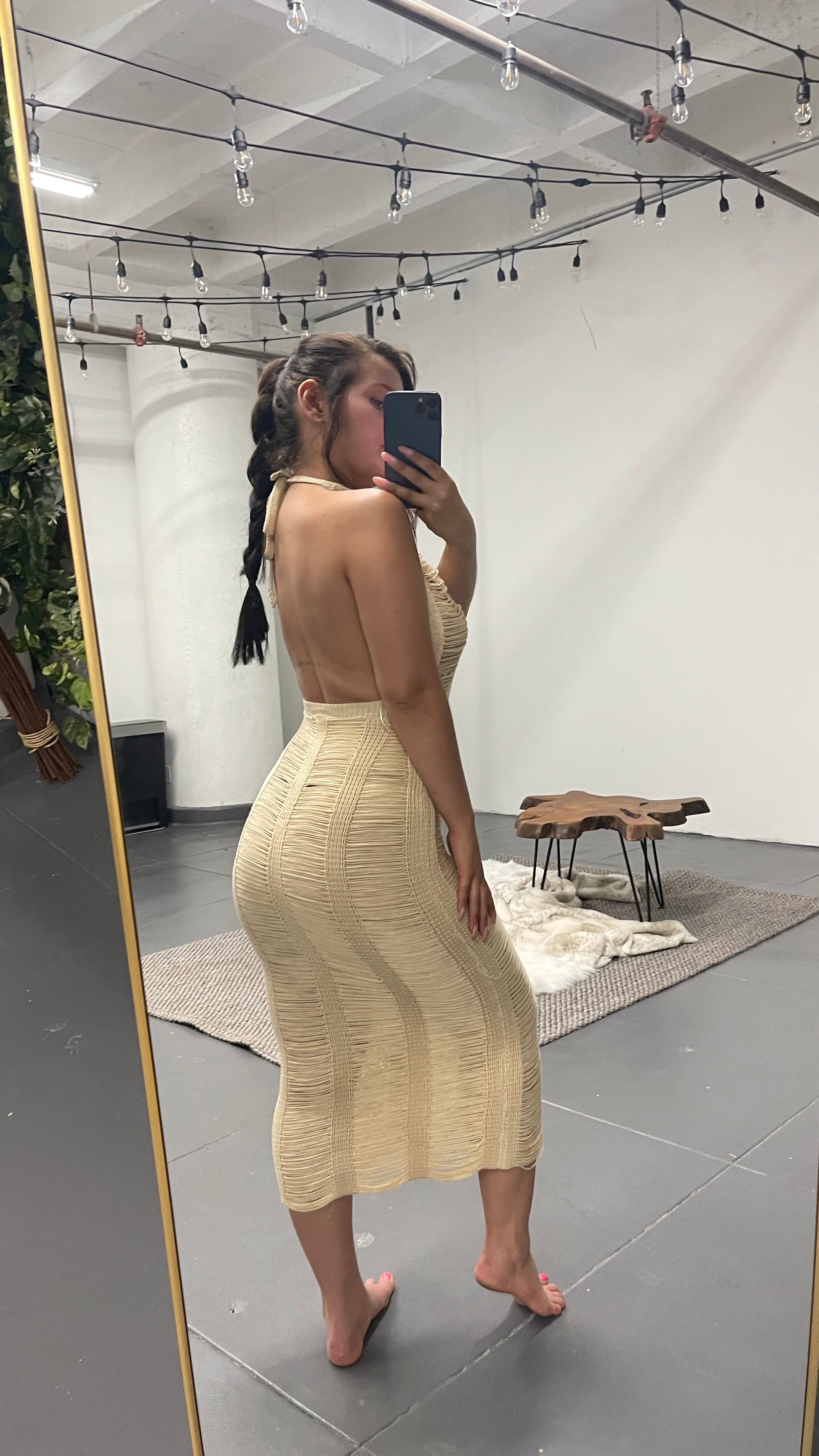 This beautiful low back dress comes with handmade stitching and body hugging material. It's lined with tight crocheting and falls on the body gracefully. It coesm with fridnge waves detailing and a haulter neck. Midi dress.